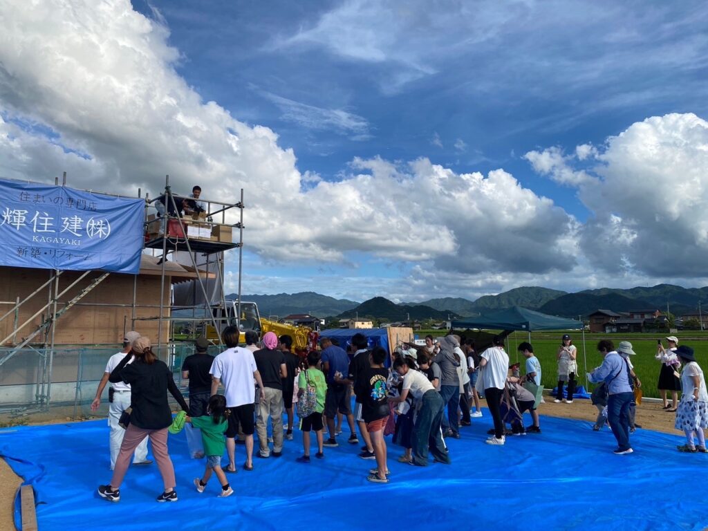 祝上棟を行いましたのでその様子をお届けいたします!たくさんの方が拾いにきてください。無事上棟完了です。